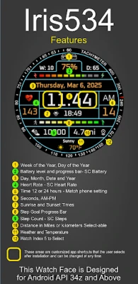 Iris534 is a multi-function watch face with stylish options that blend functionality with customization. Its main purpose is for high visibility and information. It is designed for Android watches using API level 34 and above.