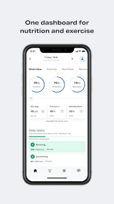 Home Dashboard: Gain insights into daily activity, nutrition, and recovery stats, accompanied by actionable advice to optimize your health scores.
